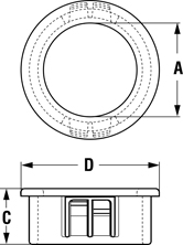 N.° de artículo | Dimensión del chasis - espesor máximo (pulg.) | Dimensión del chasis - Diámetro del orificio de montaje (pulg.) | Dim A (pulg.) | Dim C (pulg.) | Dim D (pulg.) | |