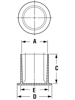 N.° de artículo | Según el tamaño de la rosca de la tapa | Dim A (pulg.) | Dim C (pulg.) | Dim D (pulg.) | Dim E (pulg.) | |