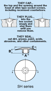 Los tapones de acabado de la Serie SH para tornillos de cabeza ciega mantienen los cuerpos extraños fuera de la cavidad y del orificio para la colocación del cabezal del tornillo. Ideales para equipos sanitarios, tornillos que necesitan un ajuste periódico, pintura en aerosol de producción y mantenimiento, y muchas otras aplicaciones. El polietileno translúcido garantiza la identificación visual de los tornillos de cabeza ciega.
